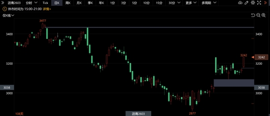 【1】盤面表現(xiàn):BU 2603主力合約日內(nèi)一路上行,強(qiáng)勢(shì)拿下能源板塊的漲幅最高。收盤價(jià)3242,較昨日收盤價(jià)+2.92%,盤中最高觸及3242,最低3169。