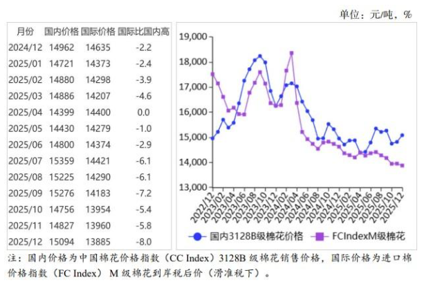 (一)國內(nèi)棉價(jià)環(huán)比上漲。下游需求保持剛性,支撐棉花季節(jié)性消費(fèi),帶動(dòng)國內(nèi)棉價(jià)上漲。12月份,國內(nèi)3128B級(jí)棉花月均價(jià)每噸15094元,環(huán)比漲1.8%,同比漲0.9%。鄭棉期貨主力合約(CF605)月結(jié)算價(jià)每噸14495元,環(huán)比漲6.6%,同比漲7.3%。