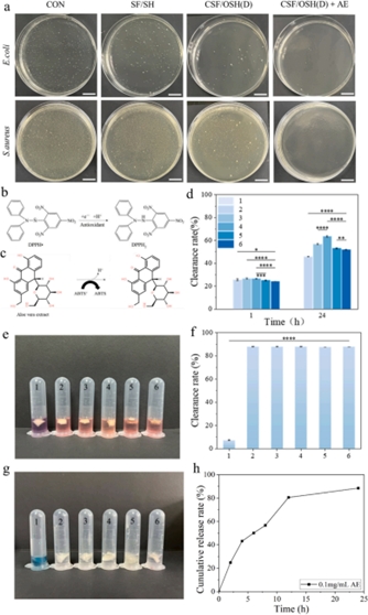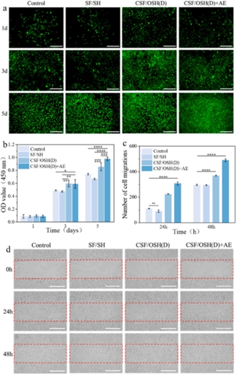 抗菌實(shí)驗(yàn)結(jié)果表明,CSF/OSH (D) +AE(蘆薈提取物)組中的水凝膠對(duì)大腸桿菌和金黃色葡萄球菌具有優(yōu)異的抗菌性能。CSF/OSH (D)水凝膠中的AE通過(guò)凝膠的孔隙結(jié)構(gòu)釋放到DPPH測(cè)試溶液中,并在其中發(fā)揮抗氧化活性。體外細(xì)胞實(shí)驗(yàn)結(jié)果顯示,水凝膠均表現(xiàn)出具有良好的細(xì)胞相容性,CSF/OSH (D) +AE 水凝膠在促進(jìn)細(xì)胞增殖和遷移方面也表現(xiàn)出良好的性能。