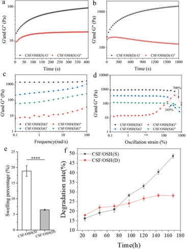 振蕩應(yīng)變掃描曲線結(jié)果顯示,測(cè)試初期CSF/OSH(S)、(D)水凝膠的G’和G”保持平行,說(shuō)明此時(shí)水凝膠內(nèi)部網(wǎng)絡(luò)結(jié)構(gòu)比較均勻,沒(méi)有發(fā)生明顯的結(jié)構(gòu)松弛或破壞。在PBS中孵育24小時(shí)后的溶脹性能結(jié)果顯示,CSF/OSH (D) 顯示出相對(duì)較低程度的腫脹。體外降解實(shí)驗(yàn)結(jié)果表明,“動(dòng)態(tài)-共價(jià)”雙交聯(lián)網(wǎng)絡(luò)可以有效減少凝膠中兩種組分的質(zhì)量損失,從而顯著降低其降解率。流變測(cè)試結(jié)果顯示,CSF/OSH(S)和(D)水凝膠的機(jī)械行為表現(xiàn)出顯著的應(yīng)變依賴性狀態(tài)。剪切速率掃描結(jié)果顯示,CSF/OSH(S)和(D)水凝膠的復(fù)合粘度隨著剪切速率的增加而逐漸降低,表明CSF/OSH(S)和(D)水凝膠均具有一定的可注射性能。在 37℃ 下粘度流變測(cè)試結(jié)果顯示,粘度隨著溫度升高而降低,隨著剪切速率的增加而降低。