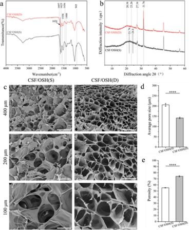 CSF和OSH基于席夫堿反應(yīng),混合后會(huì)自發(fā)凝膠化。通過(guò)前期研究發(fā)現(xiàn),當(dāng)CSF/OSH的體積比為1/2時(shí),CSF/OSH具有更好的理化性能和基本成型能力。從紅外光譜曲線可以看出,CSF/OSH雙交聯(lián)(D)水凝膠中雙交聯(lián)網(wǎng)絡(luò)內(nèi)的氨基和羧基之間形成了穩(wěn)定的酰胺鍵,以及酯鍵的存在。結(jié)晶度結(jié)果表明交聯(lián)后,CSF二級(jí)結(jié)構(gòu)中穩(wěn)定的Silk II結(jié)構(gòu)增加,分子構(gòu)象轉(zhuǎn)變?yōu)棣?折疊結(jié)構(gòu)。CSF/OSH(D)水凝膠具有更致密和更均勻的多孔結(jié)構(gòu),這種多孔結(jié)構(gòu)使氧氣和其他營(yíng)養(yǎng)物質(zhì)能夠在水凝膠的 3D 網(wǎng)絡(luò)結(jié)構(gòu)內(nèi)自由運(yùn)輸。這是由于CSF/OSH(D)水凝膠體系中同時(shí)存在亞胺、酰胺和酯鍵,導(dǎo)致材料的交聯(lián)密度增加和交聯(lián)位點(diǎn)數(shù)量增加。