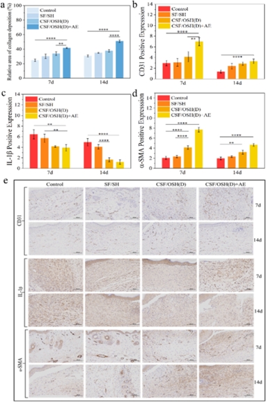 為了了解CSF/OSH(D)+AE水凝膠在真實(shí)傷口上的愈合情況,建立了糖尿病小鼠模型。結(jié)果顯示,CSF/OSH(D)+AE水凝膠組的傷口愈合速度明顯快于其他組。治療第14天,CSF/OSH(D)+AE水凝膠組已形成完整的表皮和真皮結(jié)構(gòu),并出現(xiàn)大量新生血管和毛囊,同時(shí)表現(xiàn)出最豐富的膠原蛋白沉積,傷口愈合逐漸進(jìn)入重塑階段:新生血管逐漸消退,CD31的陽(yáng)性表達(dá)也逐漸減少,促進(jìn)膠原蛋白重組,疤痕形成減弱。