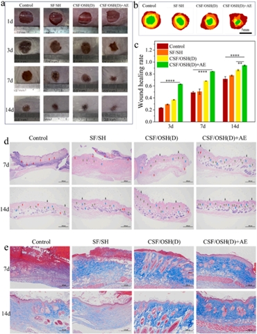 圖7. CSF/OSH (D) +AE 水凝膠的傷口愈合和組織學(xué)結(jié)果
