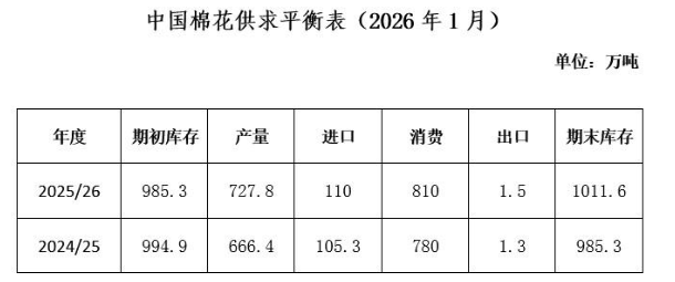 美國(guó)農(nóng)業(yè)部(USDA)1月供需報(bào)告顯示,2025/26年度全球棉花產(chǎn)量下調(diào)至2600.3萬(wàn)噸,消費(fèi)量上調(diào)至2589.2萬(wàn)噸,調(diào)整方向偏多;其中美棉產(chǎn)量下調(diào)至303.1萬(wàn)噸,環(huán)比調(diào)減2%。