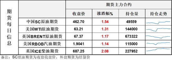 【1】WTI主力原油期貨收漲0.82美元,漲幅1.31%,報(bào)63.21美元/桶;布倫特主力原油期貨收漲0.78美元,漲幅1.17%,報(bào)67.37美元/桶;INE原油期貨收漲1.54%,報(bào)462.7元。