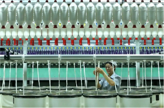 2025年8月22日,山東省青島市即墨區(qū)龍山街道一家科技紡織企業(yè)的工人在智慧紡紗生產(chǎn)線上生產(chǎn)高端纖維