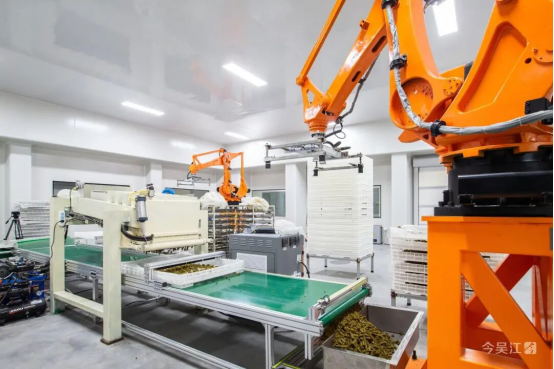推開(kāi)一扇氣密門(mén),映入眼簾的是一字排開(kāi)的12間標(biāo)準(zhǔn)化智慧蠶房。在中科繭源的數(shù)智化車(chē)間里,沒(méi)有成片的桑田,只有一排排標(biāo)準(zhǔn)化蠶架整齊排列。在物聯(lián)網(wǎng)系統(tǒng)的精準(zhǔn)調(diào)控下,溫濕度、光照、通風(fēng)等環(huán)境參數(shù)實(shí)時(shí)顯示在中央控制室的大屏上;機(jī)械臂與AGV轉(zhuǎn)運(yùn)小車(chē)安靜而有序地協(xié)作,進(jìn)行飼料投喂與物料流轉(zhuǎn);“蠶寶寶”們享用的不再是新鮮桑葉,而是經(jīng)過(guò)科學(xué)配比、高溫蒸煮加工而成的營(yíng)養(yǎng)顆粒飼料。