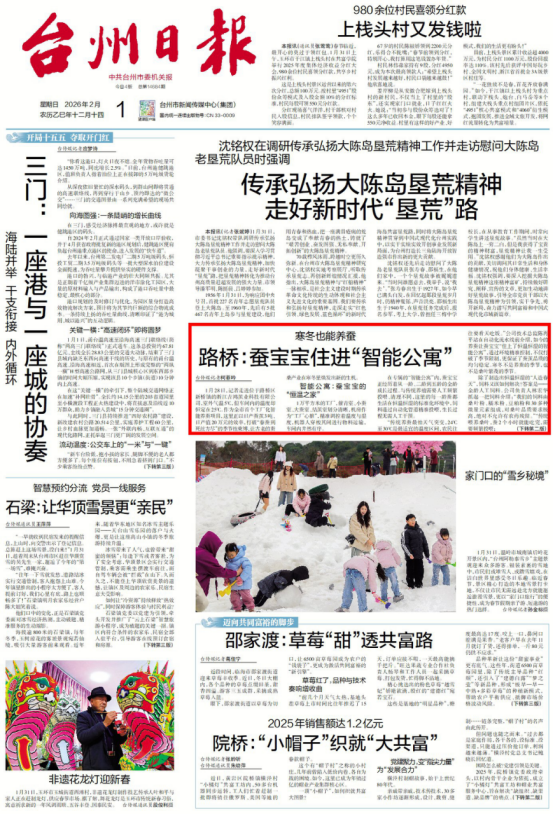 1月28日,記者走進位于路橋區(qū)新橋鎮(zhèn)的浙江吉鴻繭業(yè)科技有限公司,室外氣溫5℃,但車間內的溫度卻恒定在25℃。作為全市首個工廠化智能養(yǎng)蠶項目,這里正以日產(chǎn)蠶繭3噸、日產(chǎn)值20萬元的效率,打破“春蠶到死絲方盡”的季節(jié)性束縛,讓古老的蠶桑產(chǎn)業(yè)在寒冬里煥發(fā)出新的生機。