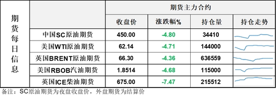 【1】WTI主力原油期貨收跌3.07美元,跌幅4.71%,報(bào)62.14美元/桶;布倫特主力原油期貨收跌3.02美元,跌幅4.36%,報(bào)66.3美元/桶;INE原油期貨收跌4.8%,報(bào)450元。