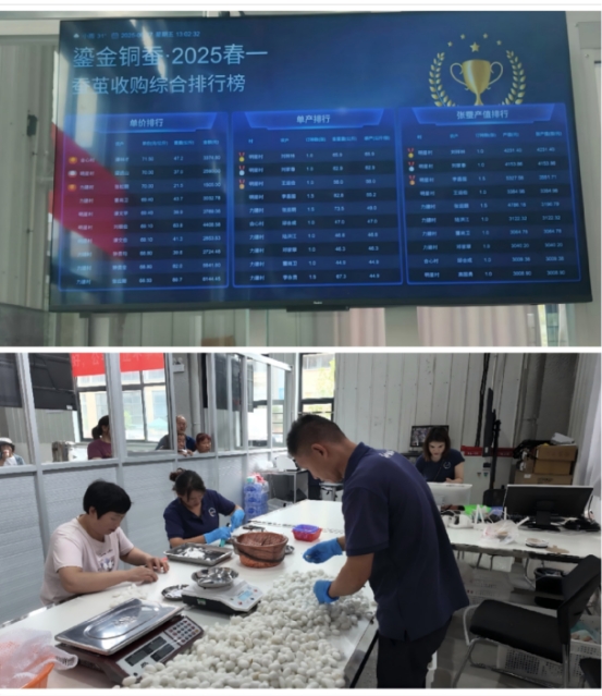 二是破“收購(gòu)難”,儀器評(píng)繭顯公平。鎏金銅蠶公司引進(jìn)鮮繭儀評(píng)電子化系統(tǒng),按“殼重、上車率、含水率、色澤、僵蛹”5項(xiàng)指標(biāo)打分,蠶農(nóng)在等候區(qū)就能通過大屏看評(píng)分、知價(jià)格。以往“毛腳繭”混著賣,現(xiàn)在6A級(jí)蠶繭每斤能多賣5-8元,“優(yōu)繭優(yōu)價(jià)”真正落地。三是提“效率難”,分段養(yǎng)殖增批次。推行“小蠶集中育、中蠶工廠育、大蠶農(nóng)戶育”的“三段式”模式,將蠶農(nóng)自養(yǎng)周期從35天壓縮到15天,全年養(yǎng)蠶批次從6批增至8批。池河鎮(zhèn)試點(diǎn)戶張產(chǎn)收益最高達(dá)4556元,比傳統(tǒng)模式多賺1000元左右。