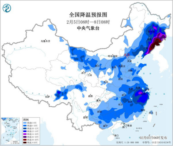 今起三天(2月5日至7日),寒潮將給中東部帶來明顯降溫,東北地區(qū)東部、江南東部降溫可超12℃,部分地區(qū)有初春重返寒冬的感覺。降溫的同時(shí),今明天中東部還會(huì)迎來大范圍雨雪天氣,安徽中南部、江蘇中南部、浙江北部、上海等地的部分地區(qū)有大到暴雪。