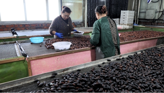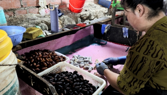董事長(zhǎng)曲學(xué)義介紹,企業(yè)日均產(chǎn)絲75至150公斤,主要出口南亞市場(chǎng),“柞蠶絲韌性好、拉力強(qiáng)、光澤度高,每噸比桑蠶絲高出約十萬元?!背榻z后的殘繭也被充分利用,剪開繭殼取出里面的蛹。蠶蛹顏色因溫度而異:高溫形成紅蛹,寓意“紅紅火火”,價(jià)格較高;低于20℃形成黑蛹。這些蛹一部分鮮銷,一部分加工成黃蛹、“神仙蛹”。