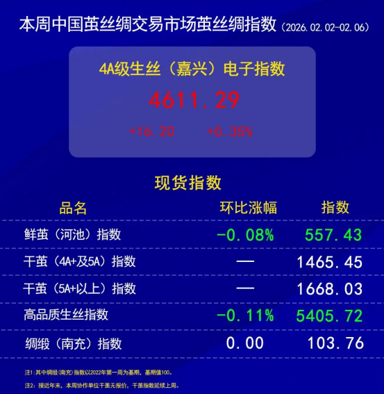 今日(2026年02月06日,周五)中國繭絲綢交易市場生絲電子指數(shù)微跌0.09%報(bào)收于4611.29點(diǎn),本周生絲指數(shù)累計(jì)上漲0.35%。B絲2022D(商檢4A級(jí)生絲):260325合約下跌0.06萬元報(bào)收于46.14萬元;260925合約下跌0.12萬元報(bào)收于46.05萬元;270325合約下跌0.03萬元報(bào)收于46.11萬元。