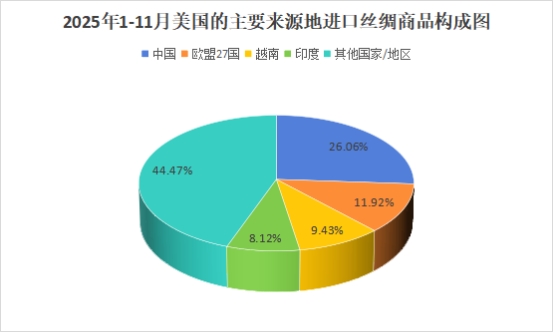 圖8:2025年1-11月美國(guó)的主要來(lái)源地進(jìn)口絲綢商品構(gòu)成圖(美國(guó)商務(wù)部數(shù)據(jù))