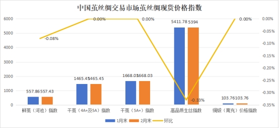 圖2:中國(guó)繭絲綢交易市場(chǎng)繭絲綢現(xiàn)貨價(jià)格指數(shù)(1月末-2月末)(數(shù)據(jù)來(lái)源:中國(guó)繭絲綢交易市場(chǎng))