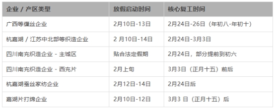 2026年春節(jié)繭絲綢行業(yè)車間放假時(shí)長(zhǎng)較往年略有延長(zhǎng),但整體變動(dòng)幅度較小,未出現(xiàn)大規(guī)模提前停工或延遲復(fù)工現(xiàn)象,成規(guī)模的繅絲、織造企業(yè)放假時(shí)長(zhǎng)與9天(往年7天)的法定春節(jié)調(diào)休時(shí)長(zhǎng)基本一致,既是企業(yè)保障員工休假權(quán)利的體現(xiàn),也是行業(yè)經(jīng)營(yíng)節(jié)奏與政府復(fù)工引導(dǎo)的共同結(jié)果。