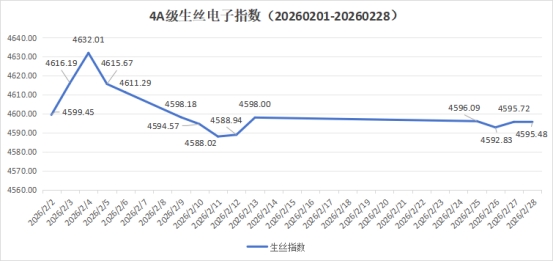 走勢(shì)特征:2月初,在外圍商品市場(chǎng)拉動(dòng)和行業(yè)內(nèi)節(jié)前備貨等因素拉動(dòng)下,生絲電子指數(shù)連續(xù)收出小陽(yáng)線,推動(dòng)生絲電子指數(shù)短期走強(qiáng)。隨著節(jié)前備貨周期逐步結(jié)束,2月6日后,價(jià)格指數(shù)連續(xù)小幅回調(diào)并進(jìn)入窄幅震蕩階段;2月14日到24日休市交易暫停;25日復(fù)市后,電子指數(shù)延續(xù)弱勢(shì)整理,反映出市場(chǎng)對(duì)節(jié)后需求復(fù)蘇的謹(jǐn)慎預(yù)期,產(chǎn)業(yè)鏈庫(kù)存消化節(jié)奏成為制約指數(shù)上行的核心因素。本月生絲電子指數(shù)收于4595.48點(diǎn)環(huán)比上月微漲0.01%。