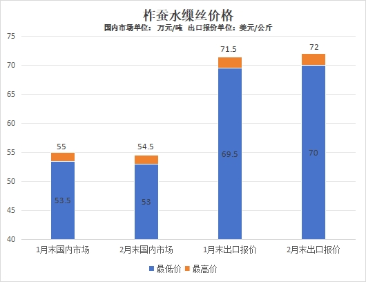 國(guó)內(nèi)市場(chǎng)2月末價(jià)格較1月末環(huán)比下跌約0.94%,主要受處于集中生產(chǎn)時(shí)間段供應(yīng)面仍有增加、需求有所下降等因素影響。但是必須要說(shuō)明的是,部分特殊定制的柞蠶絲價(jià)格仍高于此區(qū)間。