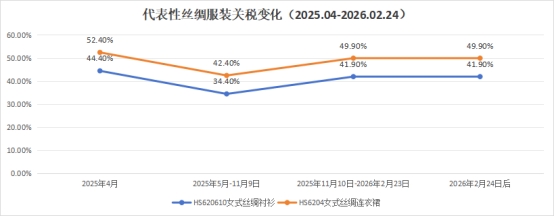 我國(guó)對(duì)美出口絲綢商品90%以上為制成品,歸入美國(guó)HTS第62章且全部列入301關(guān)稅加征清單。代表性品類如女式絲綢襯衫(HS 620610)、女式絲綢連衣裙(HS6204)關(guān)稅分別維持在41.9%、49.9%,新政后未發(fā)生調(diào)整,301關(guān)稅的對(duì)華限制仍未松動(dòng)。