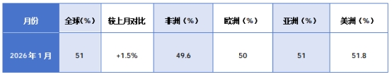 1月全球制造業(yè)PMI達(dá)51%,較上月提升1.5個(gè)百分點(diǎn),各洲均保持?jǐn)U張或接近擴(kuò)張區(qū)間。