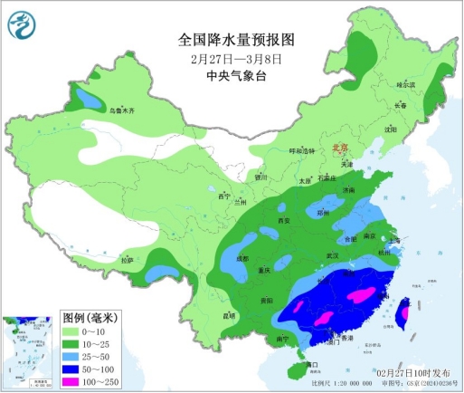 圖11:全國(guó)降水量預(yù)報(bào)圖(2月27日一3月8日)來(lái)源:中央氣象臺(tái)