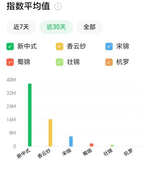 香云紗:近30天微信指數(shù)均值遙遙領(lǐng)先,遠(yuǎn)超其他品類,且在2月整體呈現(xiàn)高位波動(dòng)的走勢(shì),顯示出其在市場(chǎng)認(rèn)知度和消費(fèi)熱度上的絕對(duì)優(yōu)勢(shì)。