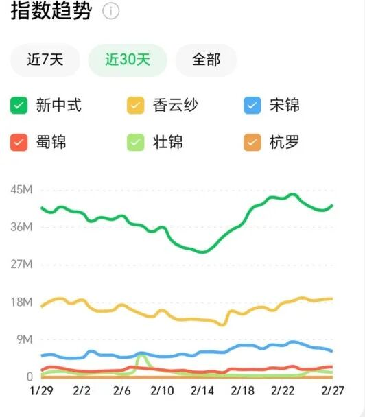 蜀錦、壯錦、杭羅:雖整體熱度不及前兩者,但在春節(jié)期間也出現(xiàn)了不同程度的熱度抬升,反映出消費(fèi)者對(duì)多元非遺絲綢品類的關(guān)注度的提升。同時(shí),杭羅薄型面料因季節(jié)原因熱度尚未提升。