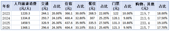 總量層面:2023-2025 年人均旅游消費(fèi)從 1220.3 元逐年攀升至 1458.5 元,旅游市場(chǎng)持續(xù)復(fù)蘇;整體仍保持在高位區(qū)間,為品質(zhì)消費(fèi)提供了基礎(chǔ)盤。