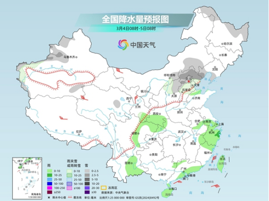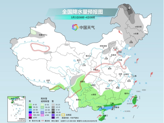 昨天,隨著冷空氣南下,中東部雨雪有所減弱,北方降雪主要出現(xiàn)在華北北部、東北地區(qū)等地,南方較強降雨則出現(xiàn)在華南地區(qū)。監(jiān)測顯示,昨天8時至今天6時,內(nèi)蒙古中東部、京津冀、山東中北部及新疆西北部等地部分地區(qū)出現(xiàn)小到中雪或雨夾雪,局地大雪;福建東南部、廣東中南部、廣西南部和西北部等地部分地區(qū)出現(xiàn)中到大雨,局地暴雨。