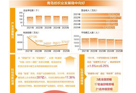 發(fā)端于1902年的紡織業(yè),被譽(yù)為青島的“母親工業(yè)”。從“上青天”輝煌,歷經(jīng)產(chǎn)業(yè)轉(zhuǎn)型升級(jí)陣痛,再到破繭新生,青島百年紡織篳路藍(lán)縷,乘風(fēng)破浪。近年來,青島錨定數(shù)智化、綠色化、高端化,推動(dòng)傳統(tǒng)紡織產(chǎn)業(yè)煥新升級(jí),產(chǎn)業(yè)規(guī)模與核心競(jìng)爭(zhēng)力持續(xù)攀升,百年產(chǎn)業(yè)綻放時(shí)代新光彩,為全國(guó)傳統(tǒng)產(chǎn)業(yè)轉(zhuǎn)型提供鮮活實(shí)踐。