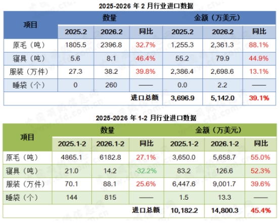綜合前兩個月來看,行業(yè)進(jìn)口總額約1.5億美元,同比大幅上漲45.4%。原毛和服裝進(jìn)口量值齊增,其中,原毛進(jìn)口金額同比上漲55.0%,服裝進(jìn)口額同比上漲39.6%。行業(yè)2025年10月開始的貿(mào)易逆差從2026年1月開始轉(zhuǎn)為順差,且2月貿(mào)易順差從1月的3604.9萬美元擴(kuò)大至4969.3萬美元。