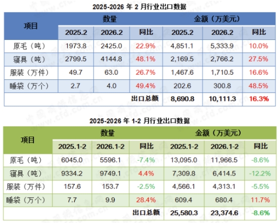 2026年2月,我國羽絨行業(yè)出口總額約1.0億美元,與2025年同期相比上漲16.3%。其中,寢具出口增幅領(lǐng)跑,出口數(shù)量和金額同比分別增長48.1%、27.5%;原毛和服裝均有不同程度漲幅,出口額同比分別增長10.0%、16.6%。原毛、寢具和服裝出口金額漲幅均小于數(shù)量漲幅,出口平均單價均有所下調(diào)。