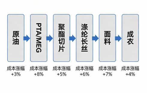 坯布、染費同步上漲,終端承壓。原料漲價快速向下游傳導(dǎo),柯橋輕紡城坯布市場兩周累計上漲 1.8 元 / 米,部分面料單周漲幅達 3 元 / 米;染廠同步提價 0.5 元 / 米,染整成本進一步抬升。面料成本占服裝總成本的 60%-70%,以沖鋒衣為例,僅滌綸原料漲價一項,500 元大眾款成本增加近 40 元,千元以上中高端款成本漲幅達 60-100 元,終端服裝價格上漲壓力顯著。