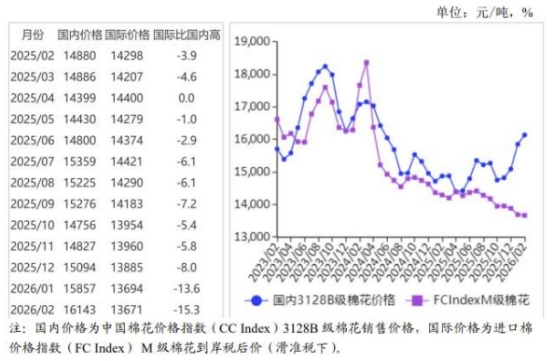 (一)國內(nèi)棉價環(huán)比上漲。新疆維吾爾自治區(qū)政府工作報告中提出,2026年新疆棉花總產(chǎn)穩(wěn)定在560萬噸左右(較2025年616.5萬噸減9.2%),市場預(yù)期2026年棉花供應(yīng)持續(xù)收緊。2月份,國內(nèi)3128B級棉花月均價每噸16143元,環(huán)比漲1.8%,同比漲8.5%。鄭棉期貨主力合約CF605月結(jié)算價每噸15330元,環(huán)比漲3.9%,同比漲10.7%。
