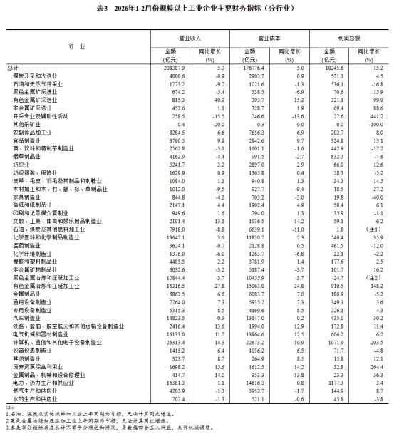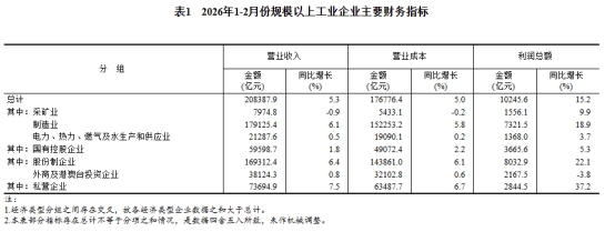 1—2月份,全國規(guī)模以上工業(yè)企業(yè)實現(xiàn)利潤總額10245.6億元,同比增長15.2%(按可比口徑計算,詳見附注二)。