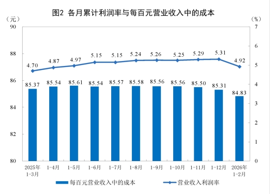 1—2月份,規(guī)模以上工業(yè)企業(yè)每百元營業(yè)收入中的成本為84.83元,同比減少0.24元;每百元營業(yè)收入中的費用為8.66元,同比增加0.02元。