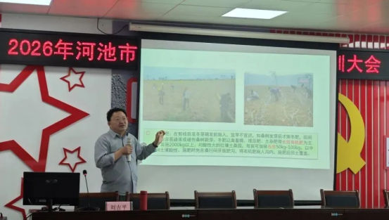 3月23日,團(tuán)隊(duì)受邀參加國家蠶桑產(chǎn)業(yè)技術(shù)體系河池綜合試驗(yàn)站春季桑蠶生產(chǎn)技術(shù)培訓(xùn)大會(huì),共有110名蠶農(nóng)參加培訓(xùn)。培訓(xùn)重點(diǎn)講解了春季桑園管護(hù)多個(gè)環(huán)節(jié)的關(guān)鍵技術(shù),并現(xiàn)場(chǎng)解答蠶農(nóng)在生產(chǎn)中遇到的實(shí)際問題。參訓(xùn)蠶農(nóng)紛紛表示,授課內(nèi)容“聽得懂、學(xué)得會(huì)、用得上”,對(duì)解決日常生產(chǎn)難題幫助很大。培訓(xùn)結(jié)束后,團(tuán)隊(duì)在宜州區(qū)農(nóng)業(yè)農(nóng)村局干部陪同下深入桑園,手把手指導(dǎo)蠶農(nóng)解決田間病蟲害防治與桑園管護(hù)難題,助力提高當(dāng)?shù)匦Q農(nóng)的種養(yǎng)水平及增產(chǎn)增收。