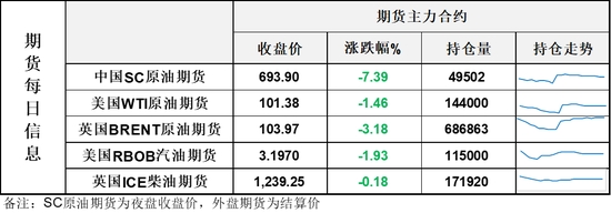 【1】WTI主力原油期貨收跌1.5美元,跌幅1.46%,報101.38美元/桶;布倫特主力原油期貨收跌3.42美元,跌幅3.18%,報103.97美元/桶;INE原油期貨收跌7.39%,報693.9元。