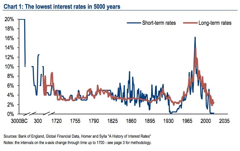 美銀美林指出,這是因為全球利率處于5000年來的最低位,高流動性又廉價的現(xiàn)金將會防止全球經(jīng)濟(jì)的崩潰。