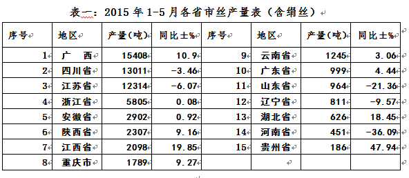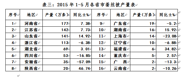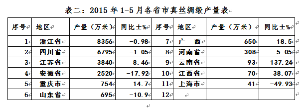 2015年1-5月各省市絲,真絲綢緞和蠶絲被產(chǎn)量表