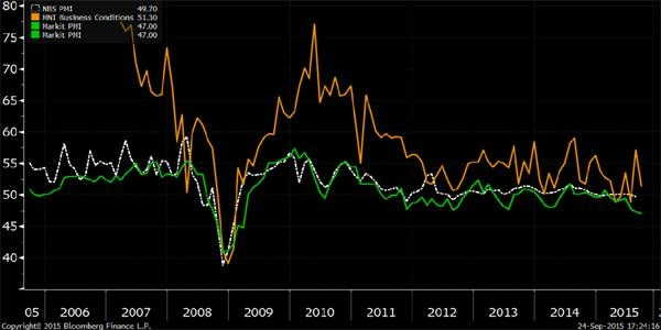 周四,國家統(tǒng)計局將發(fā)布9月份采購經理指數(shù),財新將公布財新中國PMI終值。財新9月份中國PMI初值從8月份的47.3跌至47,已經降低了市場預期。如果國家統(tǒng)計局9月份的PMI從8月份的49.7進一步下跌,會給中國經濟增長減速以及刺激政策未能拉升經濟進一步敲響警鐘。官方PMI偏重全國規(guī)模以上國有企業(yè),這些企業(yè)是貸款成本降低和其它政府支持政策的最先受益者。