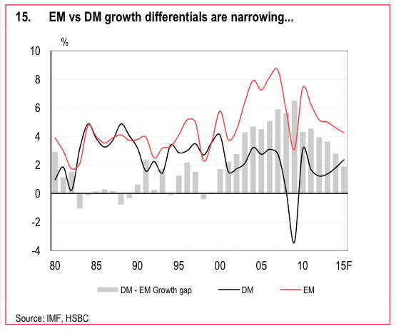 對(duì)于新興市場前景的展望,此前匯豐銀行亦持悲觀觀點(diǎn),其認(rèn)為“新興市場與發(fā)達(dá)經(jīng)濟(jì)體的經(jīng)濟(jì)增速差距在不斷收窄,這不一定是因?yàn)榘l(fā)達(dá)經(jīng)濟(jì)體表現(xiàn)更好,而是新興市場表現(xiàn)更差,領(lǐng)先指標(biāo)也沒有看到任何改善的跡象?!?/p>
