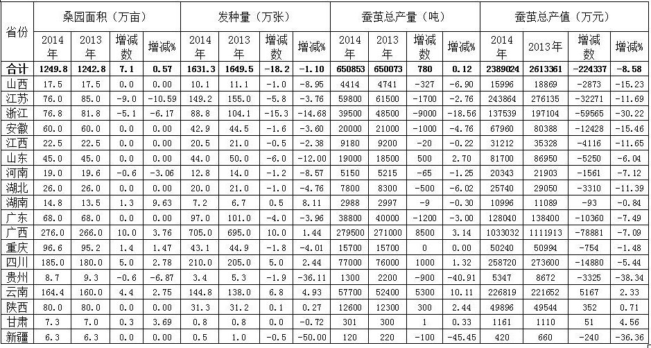 2014年全國桑蠶生產(chǎn)情況統(tǒng)計表