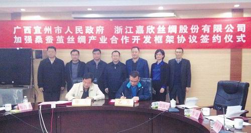 3月14日,嘉欣絲綢董事長周國建,帶領(lǐng)公司總裁室的相關(guān)領(lǐng)導及繭絲業(yè)務(wù)部門的經(jīng)理等,前往廣西宜州地區(qū)進行了考察交流,并與宜州市人民政府簽訂了加強繭絲綢產(chǎn)業(yè)合作開發(fā)的框架協(xié)議。中共宜州市市委書記周飛,中共宜州市市委副書記、市人民政府市長梁寧,中共宜州市市委副書記龍校等領(lǐng)導,以及宜州市的桑蠶循環(huán)辦、發(fā)改局、工信局、招商局、商務(wù)局、金融辦、絲綢行業(yè)協(xié)會等政府職能部門,參加了隆重的簽字儀式。嘉欣絲綢總裁徐鴻和中共宜州市委常委、市人民政府副市長韋茂明,代表雙方在合作框架協(xié)議上簽字。合作框架協(xié)議的簽訂,預示著嘉欣絲綢深度融入中西部繭絲綢行業(yè)的戰(zhàn)略性步驟的正式開啟。