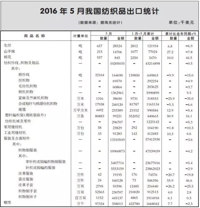 5月,紡織品服裝出口繼續(xù)保持增長,但隨著同比基數(shù)的逐步擴(kuò)大,增幅較前兩月明顯縮小,按美元計(jì)當(dāng)月僅增長0.5%,增幅分別比3月和4月下降33.6個(gè)和4.4個(gè)百分點(diǎn)。