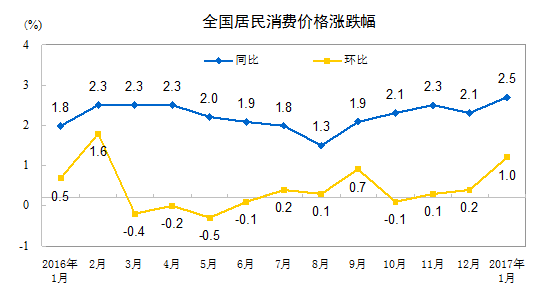 2017年1月份,全國(guó)居民消費(fèi)價(jià)格總水平同比上漲2.5%。其中,城市上漲2.6%,農(nóng)村上漲2.2%;食品價(jià)格上漲2.7%,非食品價(jià)格上漲2.5%;消費(fèi)品價(jià)格上漲2.2%,服務(wù)價(jià)格上漲3.2%。