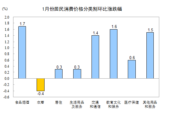 1月份,其他七大類價(jià)格環(huán)比六漲一降。其中,教育文化和娛樂、其他用品和服務(wù)、交通和通信、醫(yī)療保健、居住、生活用品及服務(wù)價(jià)格分別上漲1.6%、1.5%、1.4%、0.6%、0.3%和0.3%;衣著價(jià)格下降0.4%。