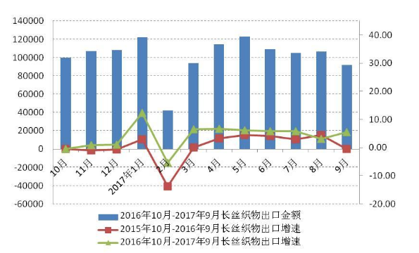 圖3 2016年10月-2017年9月我國化纖長(zhǎng)絲織物出口情況