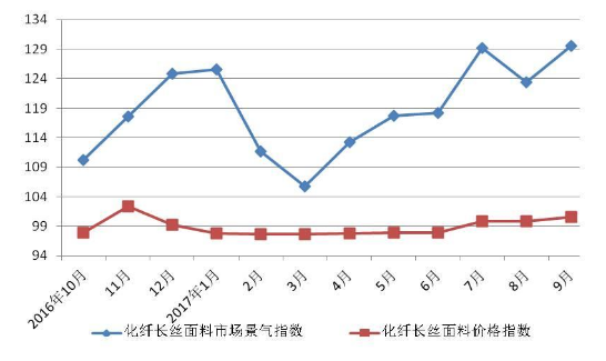 圖6 2016年10月~2017年9月盛澤地區(qū)化纖長(zhǎng)絲面料市場(chǎng)景氣、價(jià)格指數(shù)走勢(shì)圖