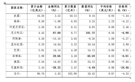隨著我國“一帶一路”政策逐步推進(jìn),亞非經(jīng)濟(jì)貿(mào)易合作增多。1~9月我國對(duì)尼日利亞出口數(shù)量、金額大幅增加,其中出口數(shù)量同比增長(zhǎng)101.72%,出口額同比增長(zhǎng)87.8%,價(jià)格同比下降6.9%。該地區(qū)對(duì)我國長(zhǎng)絲織物有較大市場(chǎng)需求,促進(jìn)了該地區(qū)的大批量進(jìn)口。